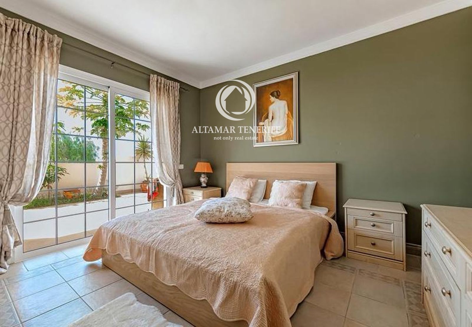 На первом этаже главная спальня располагает собственной ванной комнатой и выходом на террасу. Две дополнительные спальни — одна также с выходом наружу — и уютная гостиная завершают уровень.